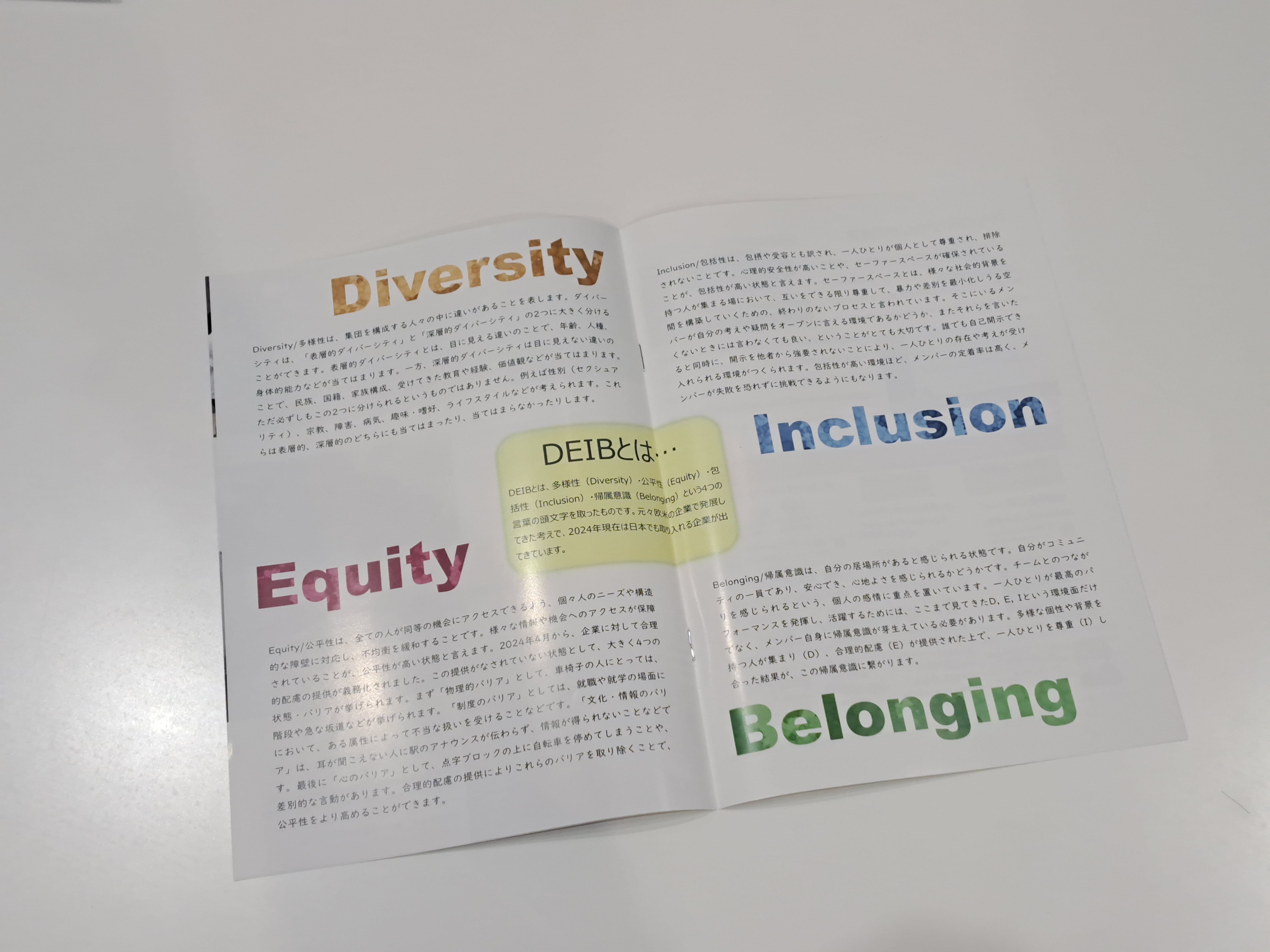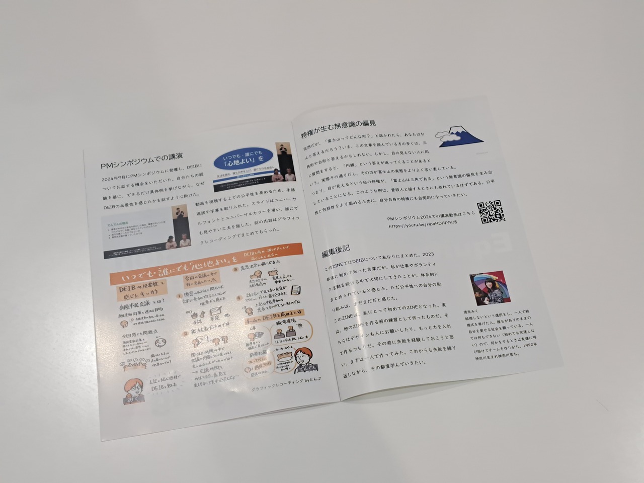 DEIB(多様性・公平性・包括性・帰属意識)についてまとめたZINEです。PMシンポジウム2024での講演をもとに制作しました。 B5サイズ・8ページ 徳光みく 2024年9月27日発行